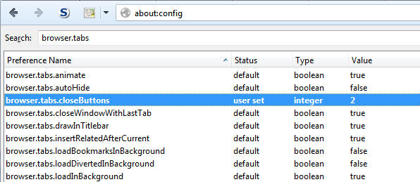 The process for Firefox is both straightforward and easy. Simply open a new tab and type about:config in the address bar. Type browser.tabs.closeButtons in the search box and modify the setting to suit your preference: