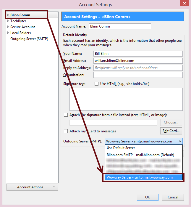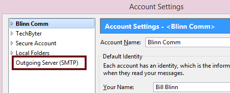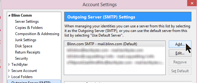 I’m going to illustrate this with images from Thunderbird because it’s one of the more popular e-mail programs. Other programs have similar settings and usually call them the by the same, or very similar, names. You’ll want to view the Outbound (or SMTP) server settings.