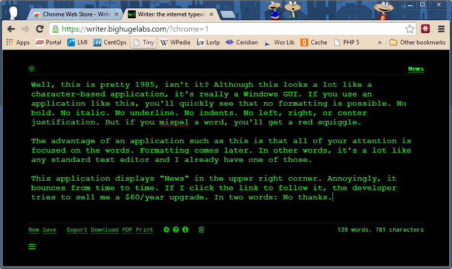 Well, this is pretty 1985, isn't it? Although this looks a lot like a character-based application, it's really a Windows GUI. If you use an application like this, you'll quickly see that no formatting is possible. No bold. No italic. No underline. No indents. No left, right, or center justification. But if you misspell a word, you'll get a red squiggle.