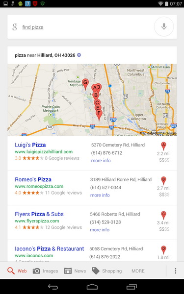 Or maybe I'm hungry for pizza. OK Google, Find pizza gives me a lits of pizza shops within 20 miles of my current location.