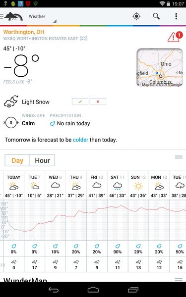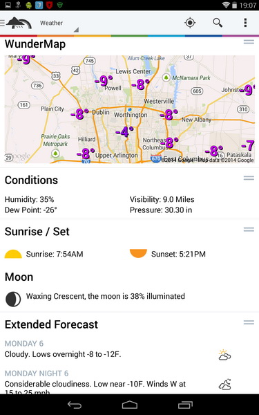 I asked about the weather (OK Google, Tell me about the weather) and the tablet opened my favorite weather application, Weather Underground. Here we see it's 8 degrees below zero currently and the chart at the bottom shows predicted conditions and temperatures for the next few days.