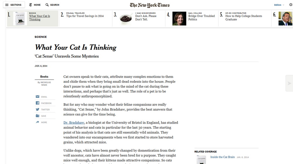 After navigating to the Science section, I thought I'd read the review of one of my favorite new books, Cat Sense, by John Bradshaw.