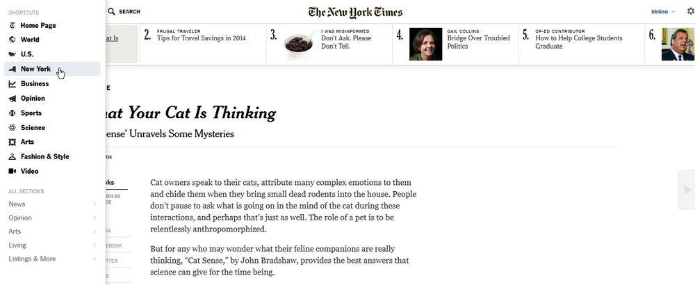 The New York Times is a large newspaper with many sections and access to these sections is addressed by the drop-down list from the upper left corner. Readers can immediately navigate to any of the major sections.