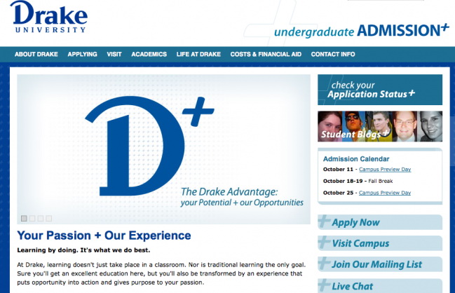 This week Drake University in Des Moines, Iowa, became the butt of jokes on Ad Week, Yahoo, Huffington Post, the Washington Post, the Des Moines Register, late-night television programs, and now on TechByter Worldwide because of its advertising message for prospective students. The campaign is branded "D+". If only the designer had allowed other creatives to see the work while it was still being developed, someone surely would have pointed out the downside of using "D+" in an advertisement for an educational institution.