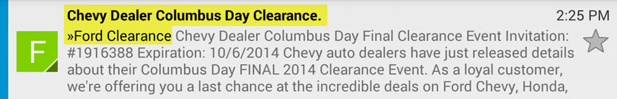 Here, for example, is an example from an idiot spammer. I had been receiving messages about the "Ford Dealer Columbus Day Clearance", many of them promising 50% to 90% off the manufacturer's suggested retail price, but then the spammer apparently decided to give General Motors a try and changed the subject to "Chevy" while accidentally leaving "Ford" in the introduction and then sliding back to "Chevy" for the rest of the message.