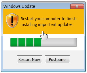 The dialog box appears to have two buttons (Restart Now and Postpone), but they arent' really buttons. In fact, clicking anywhere on the rectange (including the "X" that makes it appear that it would close the box) will simply run whatever lurks behind the link.